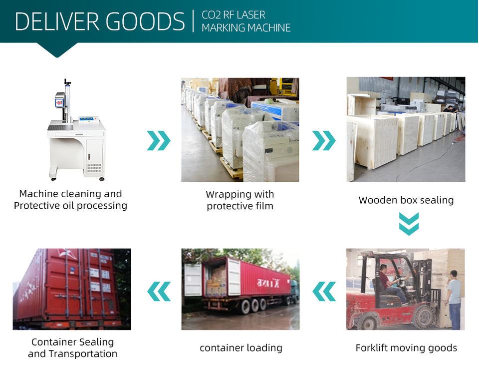 Cada máquina está empaquetada con gran cuidado y material resistente. Se embala con películas adhesivas primero y luego bolsas de película. Por último, se embala con caja de madera reforzada con la barra de hierro en la parte superior e inferior. Toda nuestra máquina láser puede proteger bien durante viajes largos por mar o en tren. Podemos transportar la máquina en barco o en formación, según sus requisitos.