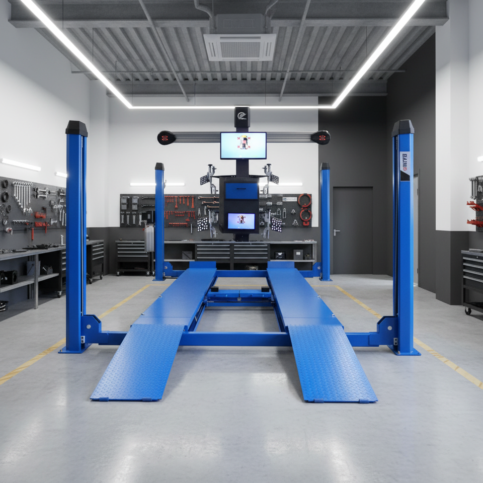 Elevador de Cuatro Postes para Alineación de Ruedas, Plataforma Integrada de Alineación y Servicio BAIWO K-688 250W, Garantía de 12 Meses