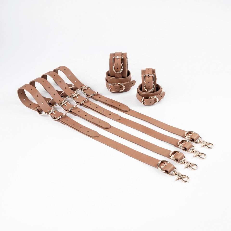 Cuatro opciones de correa para ataduras de cama, cuero de vaca con herrajes fuertes, gran equipo de bondage para tobillo y muñeca de cama de gran tamaño