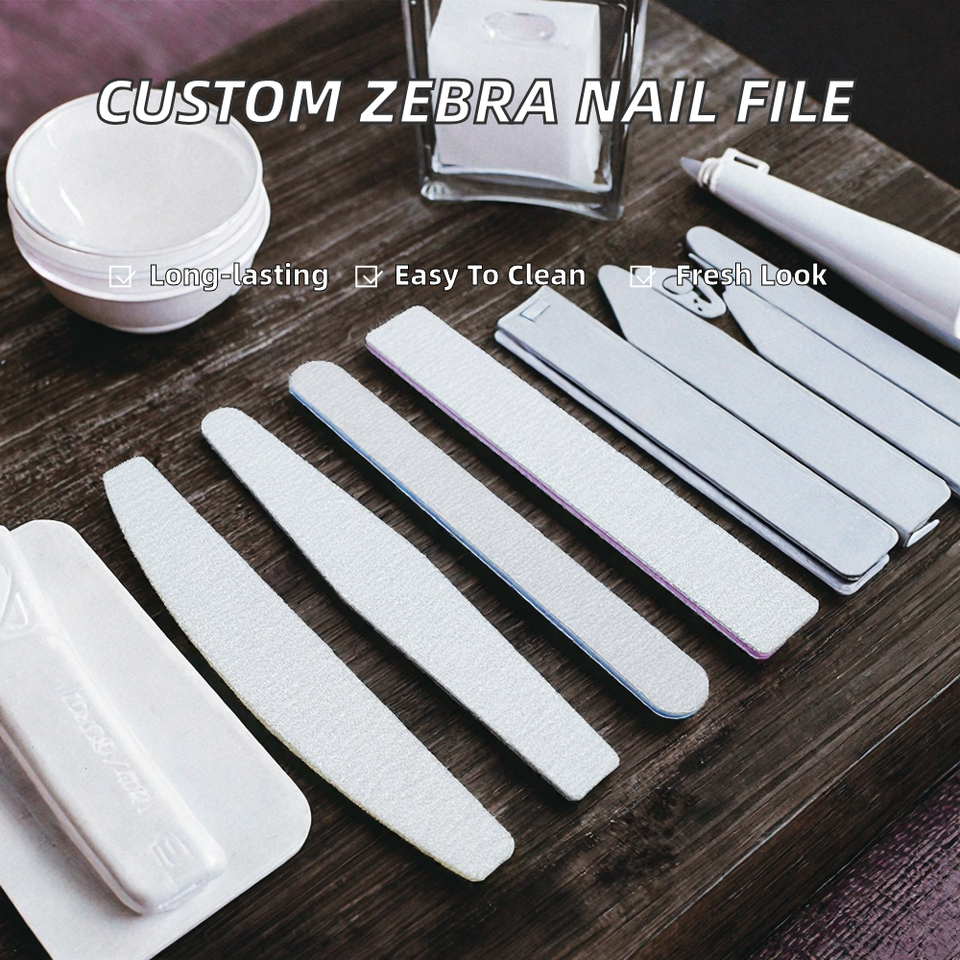 Lima de uñas de doble cara duradera con diseño de cebra y logotipo personalizado, papel de lija de China 80/100/180/240, lima de uñas lavable de media luna