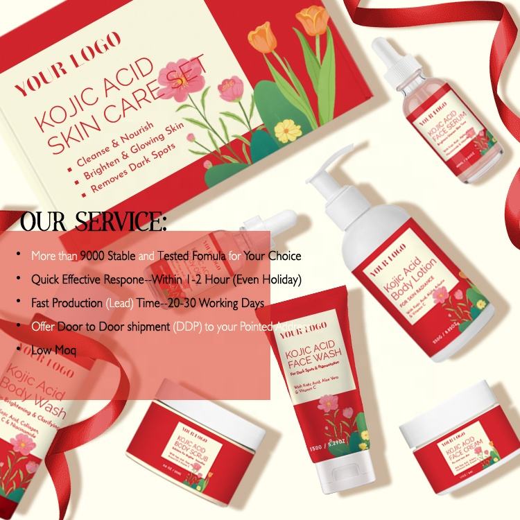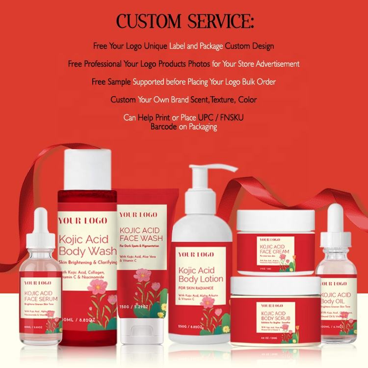 Set de Productos para el Cuidado de la Piel con Ácido Kójico, Diseño Personalizado Gratuito, Productos Naturales y Orgánicos con Vitamina C, Hidratante Facial y Corporal, Iluminador, Venta al por Mayor