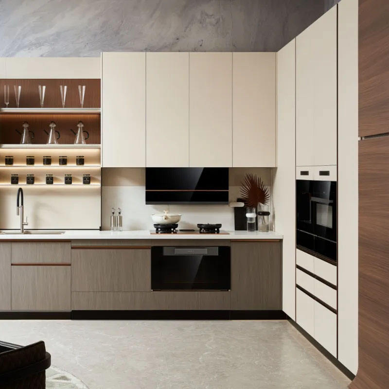 Muebles para el hogar de diseño gratuito, gabinetes de cocina en forma de L de lujo ligeros italianos personalizados, encimera de madera de instalación en el sitio