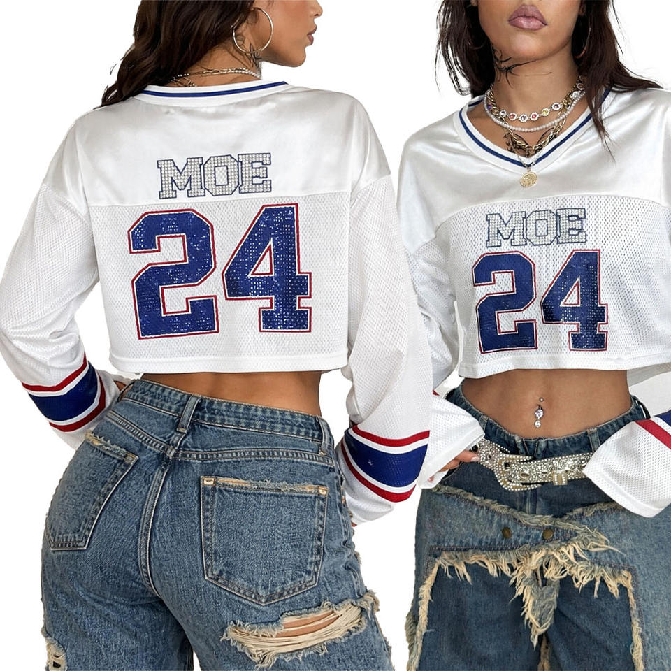 Camiseta Corta Sublimada de Poliéster con Diseño Personalizado, Estilo Y2K, Manga Larga, Cuello en V, Camiseta Gráfica de Fútbol Americano para Mujer, Venta al Por Mayor