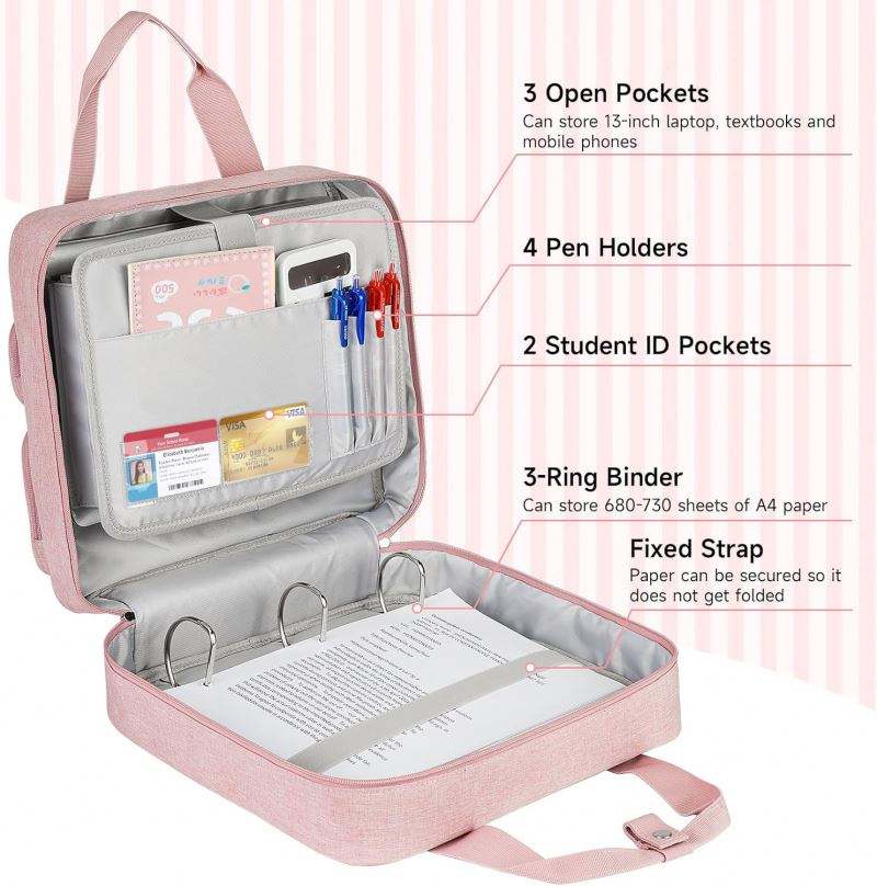Carpeta con Cierre BSCI de Muestra Gratuita, con 3 Anillas, Asa, Correa de Hombro Extraíble y Bolsillos, Carpeta con Cierre para Material Escolar