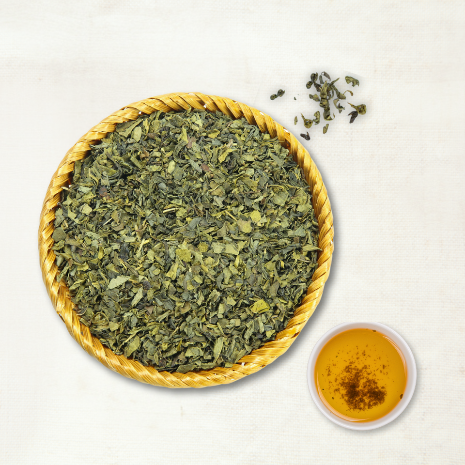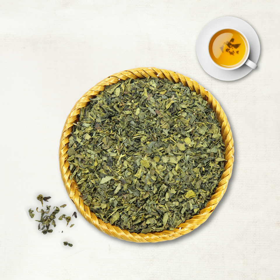 Muestra gratis de té verde roto, hoja pequeña, paquete de té de frutas personalizado en bolsas de pie, Té suelto, embalaje personalizado
