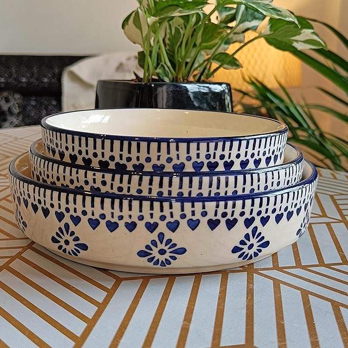 Juego de muestra gratis de tres cuencos de cocina redondos de madera con laca de grado alimenticio blanco y azul Mazarine