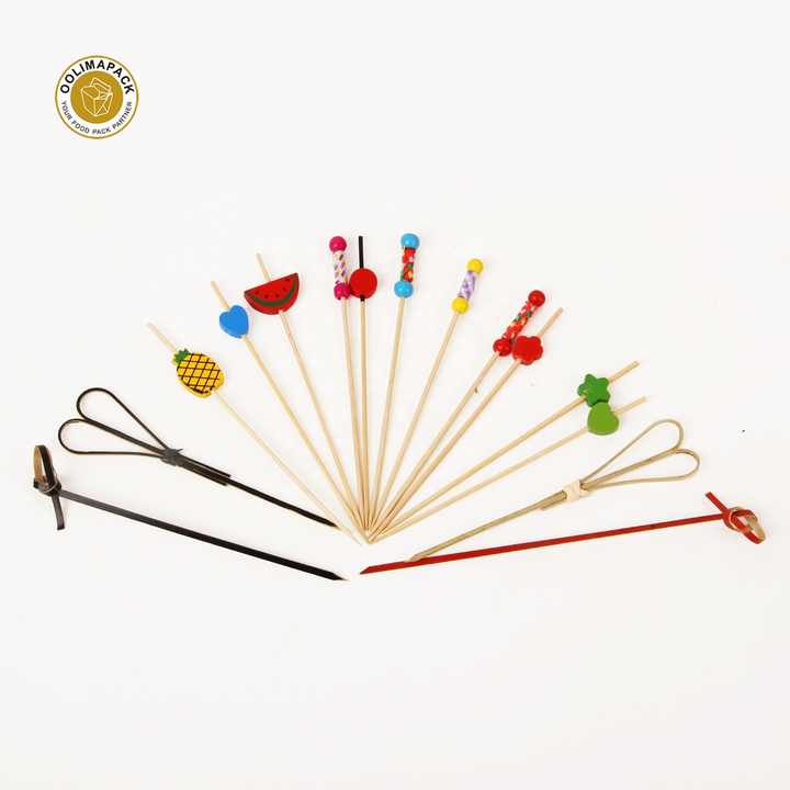 Palitos de bambú para frutas, brochetas decorativas compostables naturales, al por mayor, varios estilos, muestra gratis