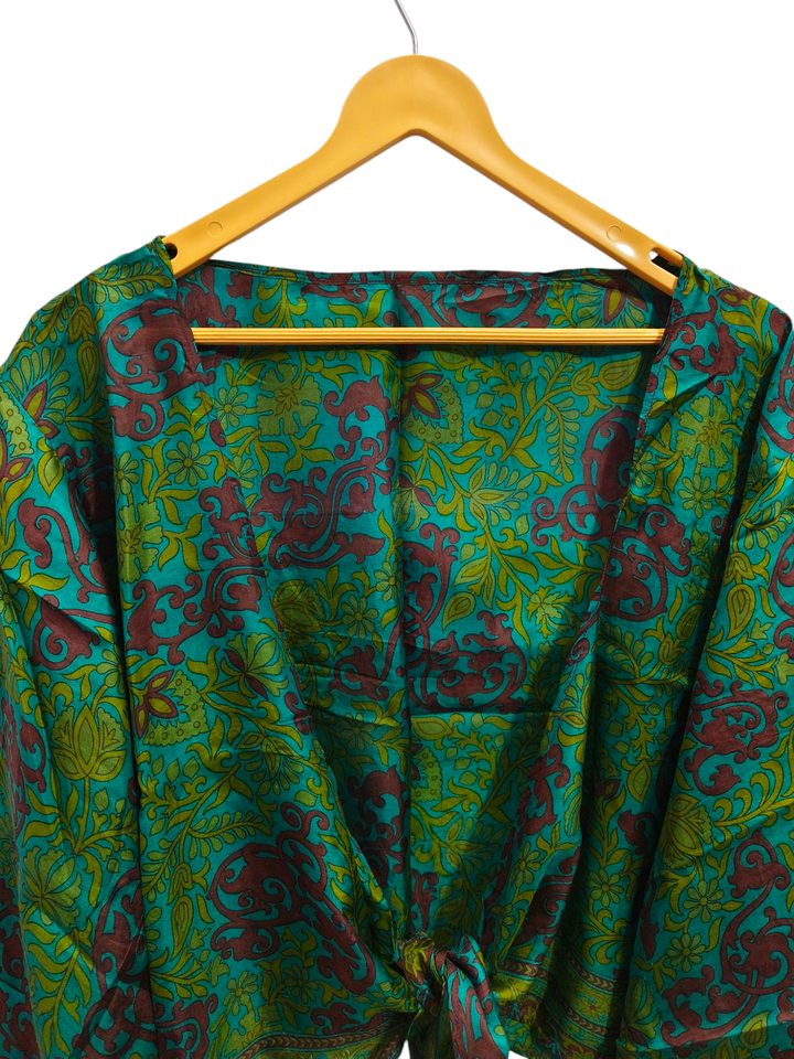 Vestido corto de seda con parte superior de tamaño libre, Top cruzado de tela Sari vintage, Top bohemio con estampado floral