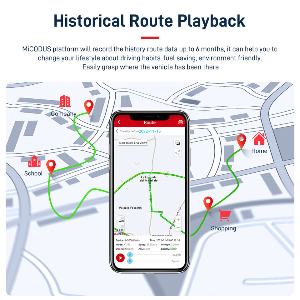 Impermeable, De carga rápida, vista de la calle, -Velocidad de alerta, De camino de reproducción, Geovalla, Reproducción histórica, alarma de exceso de velocidad, alarma de vibración, Monitor de temperatura, Batería de gran capacidad