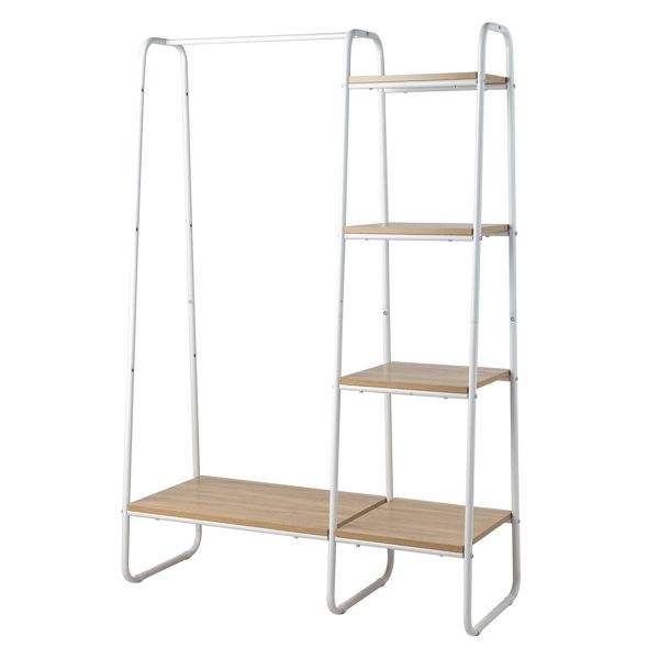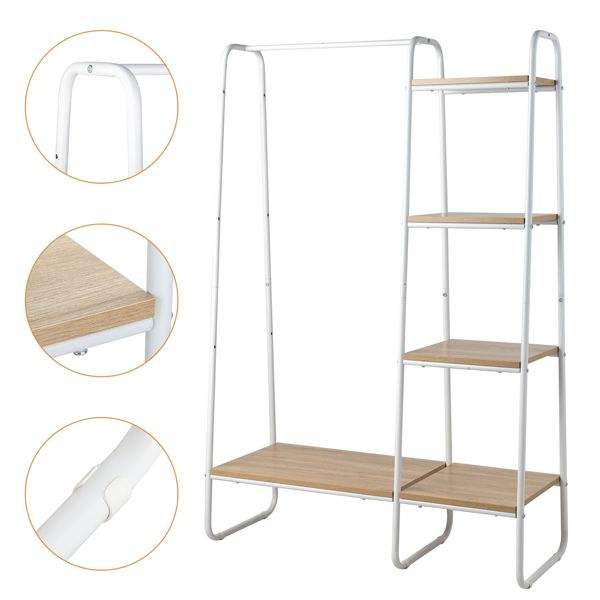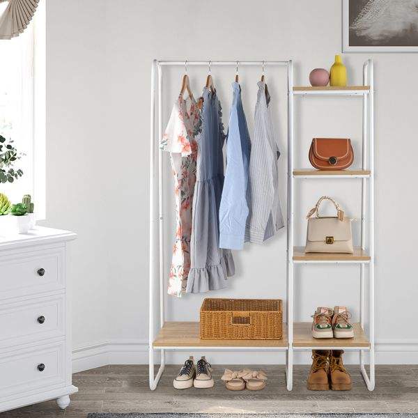 Perchero Metálico Resistente con 5 Estantes de Madera Blancos, Perchero Independiente para Ropa