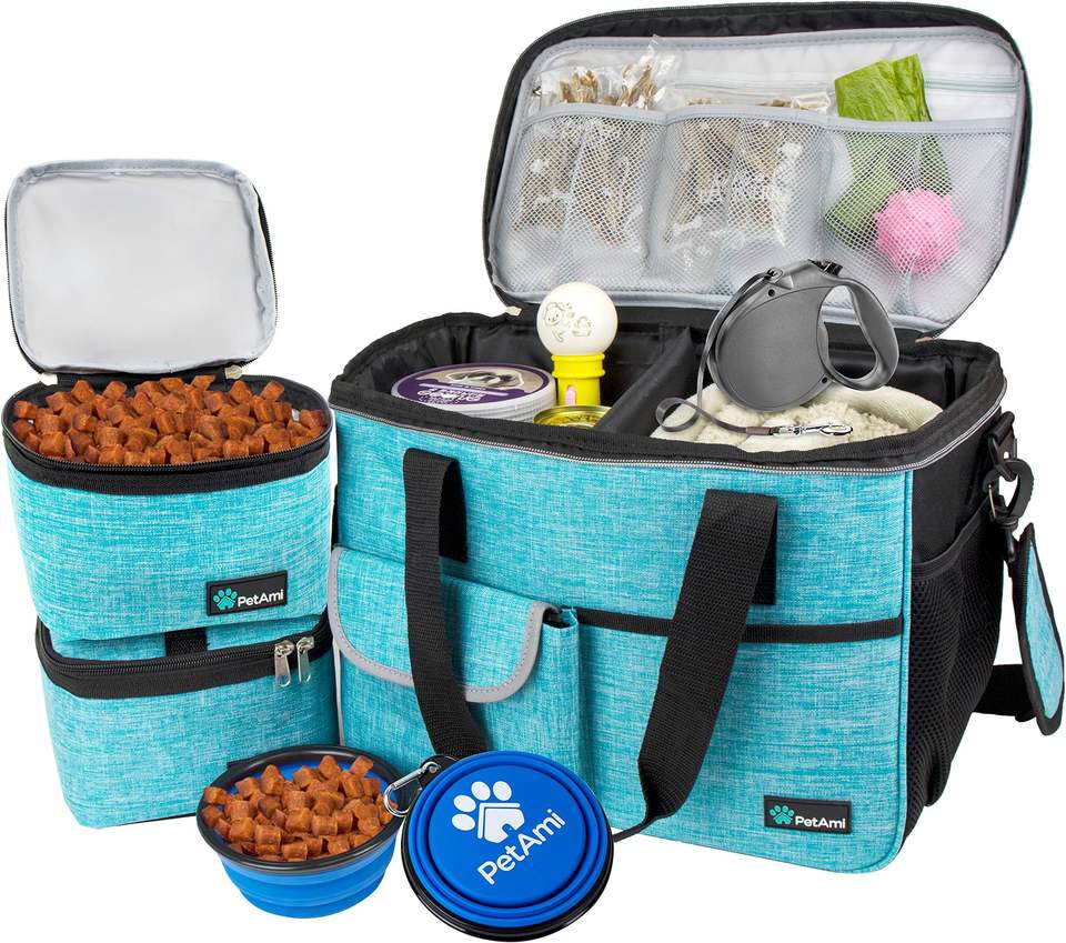 Muestra gratuita de bolsa de viaje para perros, accesorios de viaje para perros para el fin de semana para acampar, bolsas de viaje para mascotas con 2 tazones plegables para perros