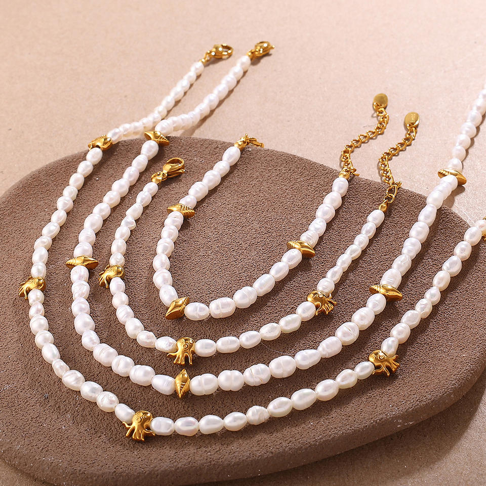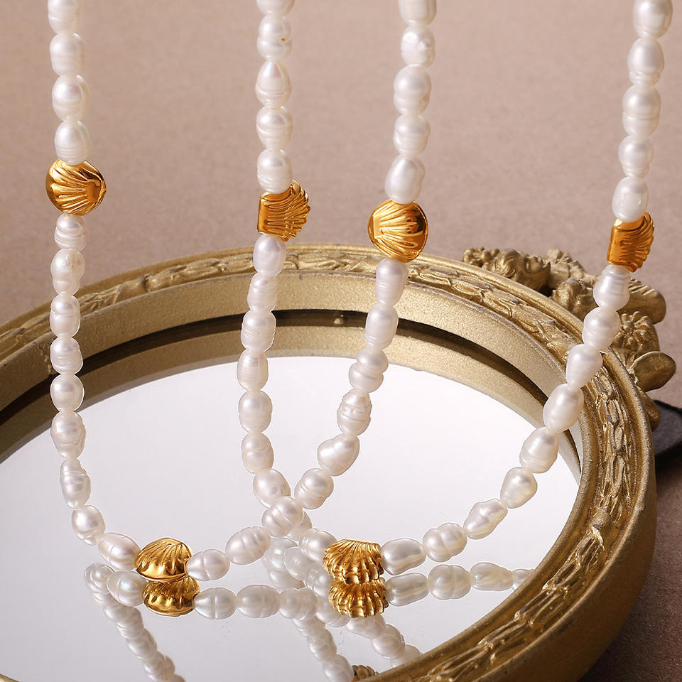 Conjunto de Collar y Pulsera de Perlas de Agua Dulce con Conchas Marinas Doradas Estilo Playa Francesa, Joyería de Moda para Mujer, Acero Inoxidable, Oro de 18K