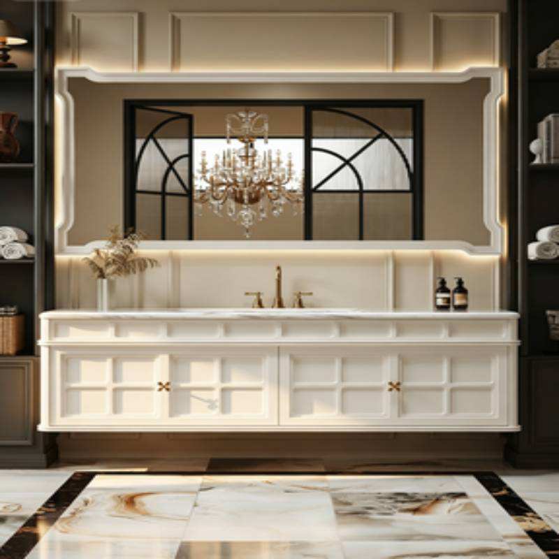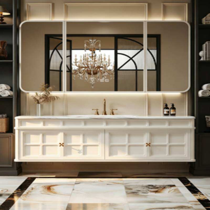 Mueble de Baño Integrado con Espejo Inteligente y Luz LED, Estilo Crema Francés, con Lavabo de Placa de Roca y Gabinete de Almacenamiento