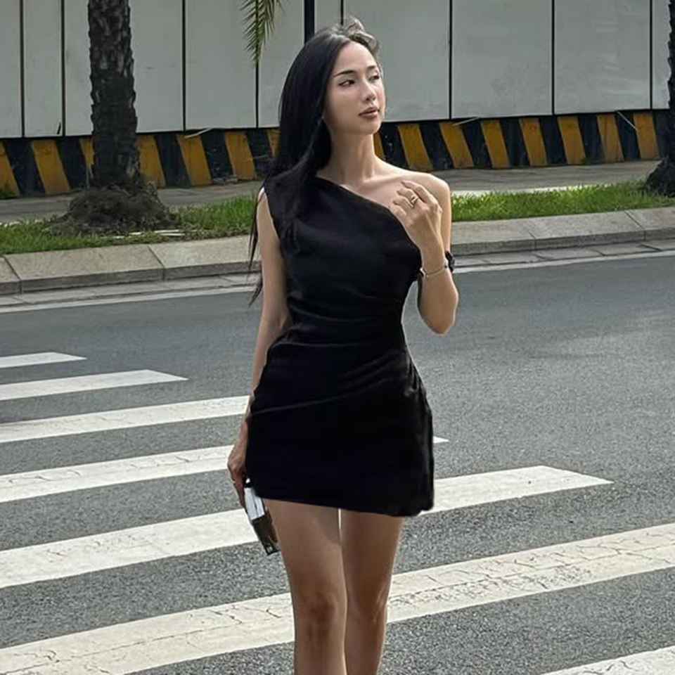 Vestido Mini Negro Elegante Francés con un Hombro Descubierto y Fruncido, Vestido Corto Ajustado a la Cintura, Atuendo Chic para Fiesta de Noche para Mujer