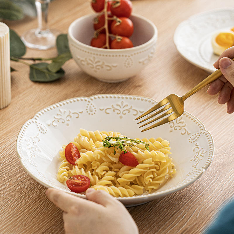 Vajilla Decorativa de Estilo Relieve Francés Exquisito, Plato Ovalado Blanco de Cerámica de 12 Pulgadas para Restaurante