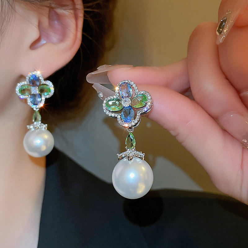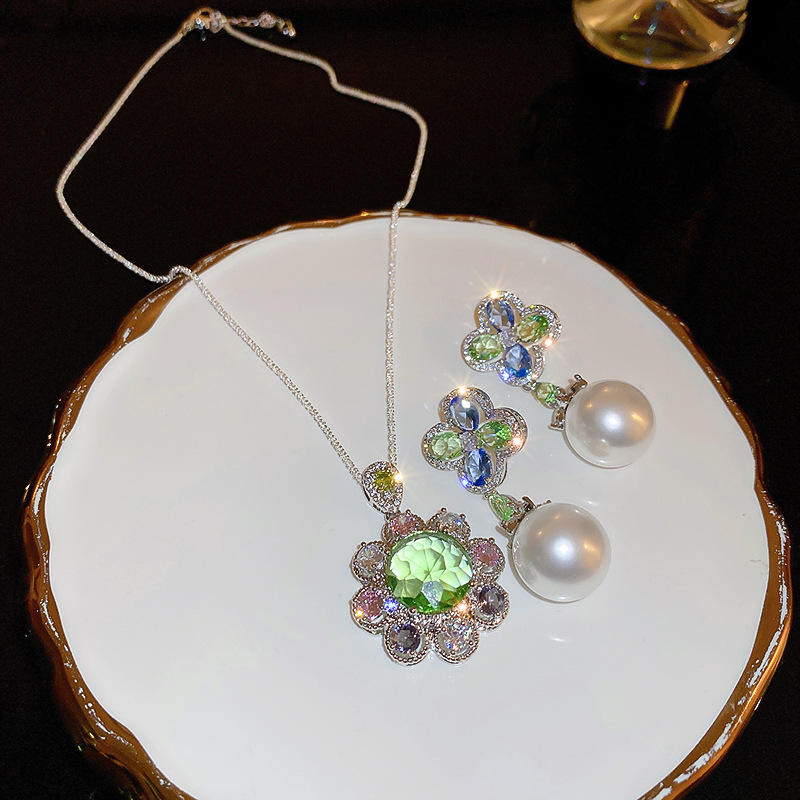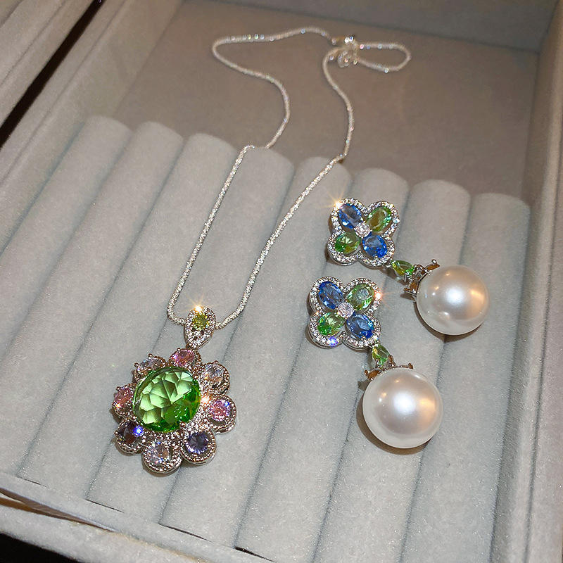 Joyería de cadena de clavícula de lujo francés aguja de plata flor colorida circón perla pendiente collar conjunto