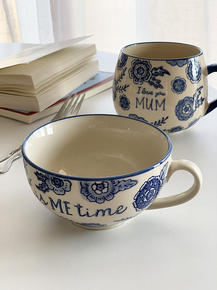 Descripción:Taza azul y blanca, taza del cereal, taza redonda del vientre