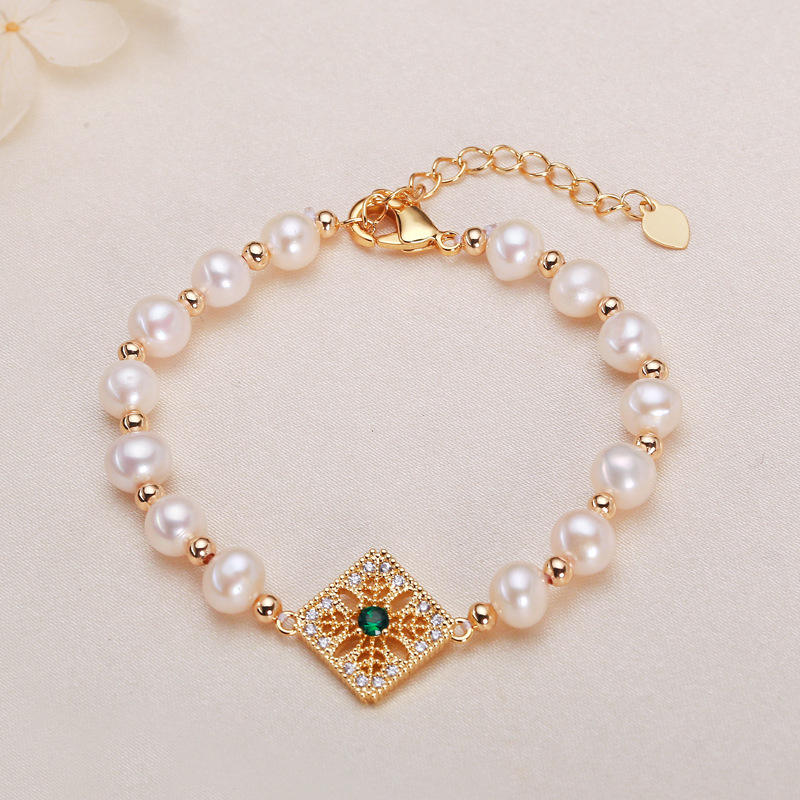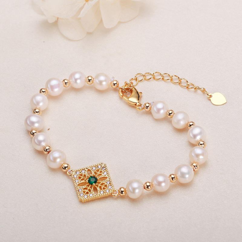 Pulsera de Moda con Perlas de Agua Dulce de 6 mm con Incrustaciones de Microcirconitas Inyectadas en Oro de 14K, Estilo Bosque Retro Francés, Regalo para Mejor Amiga