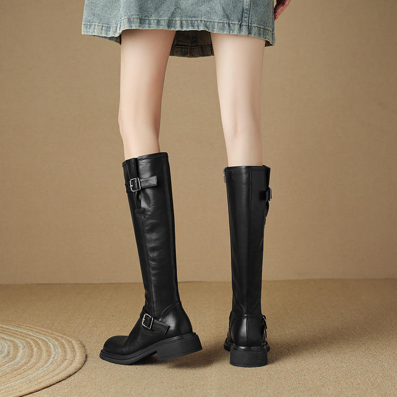 Botas de Caballero Retro Francesas Transpirables para Primavera/Otoño/Invierno con Hebilla Redonda y Cremallera Lateral, Botas Altas Estilo Western para Mujer