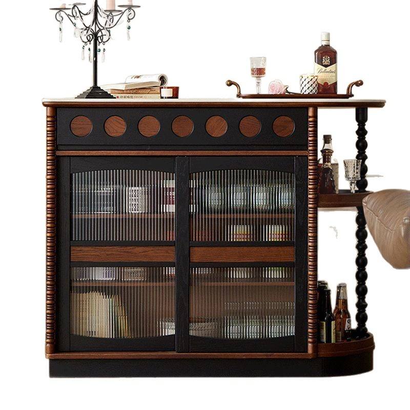 French Retro Style Solid Wood Bar Cabinet With Glass Doors And Open Storage For Living Room Or Entryway
