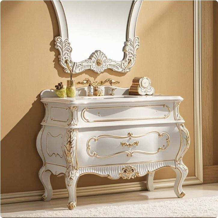 Mueble de Baño Estilo Francés, Diseño de Madera Maciza, Gabinetes de Baño con Espejo, Mueble de Baño