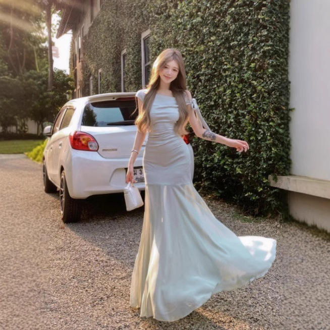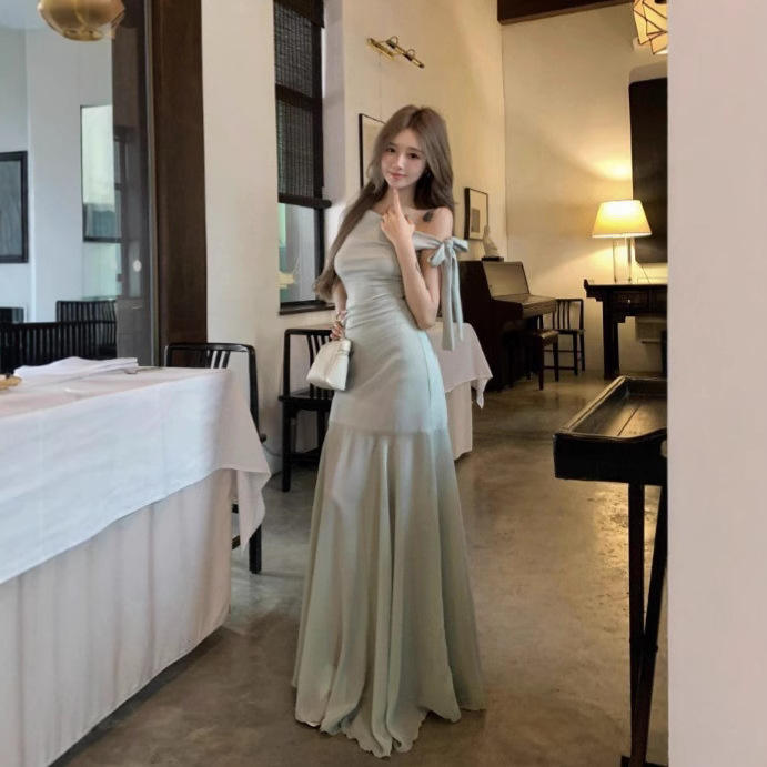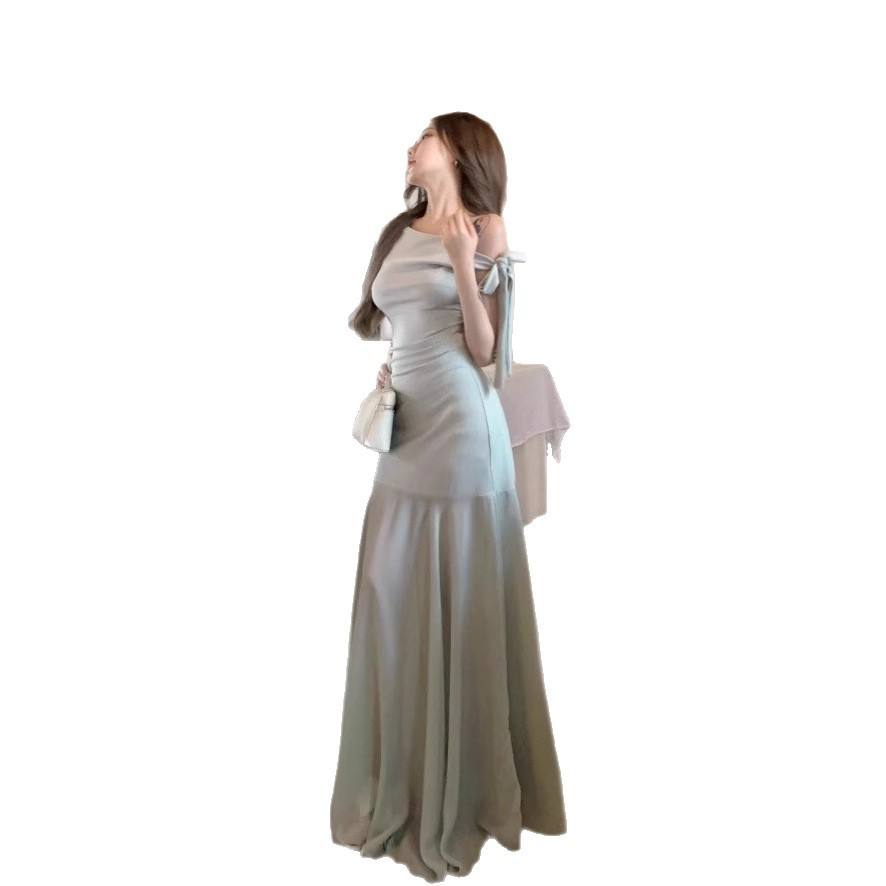 Vestido de malla verde estilo francés para mujer, largo hasta el suelo, cintura natural, asimétrico, de gasa, color liso, poliéster/algodón, para verano
