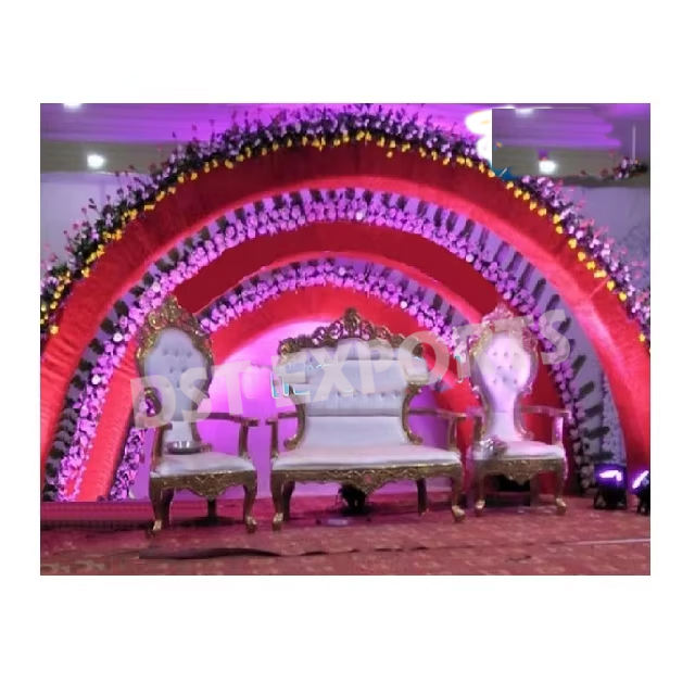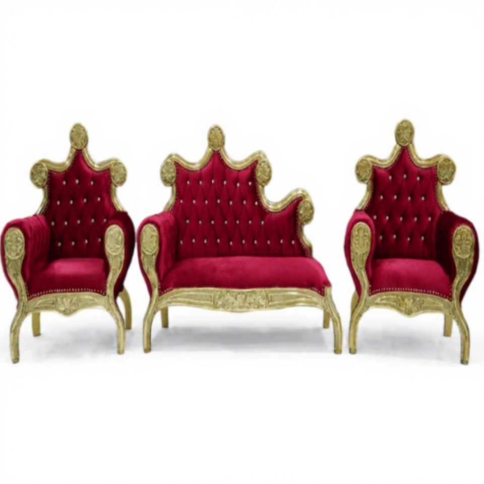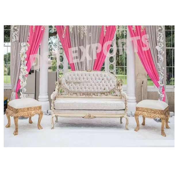 Juego de sofá de boda profesional de estilo francés para escenario, sillas de escenario de boda de tamaño personalizado de madera tratada dorada roja de lujo moderna
