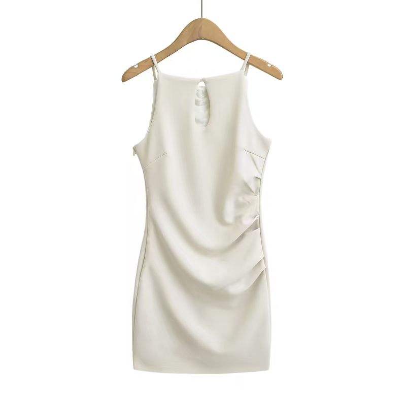 Vestido de Primavera Estilo Francés con Diseño Plisado Calado, Cintura Ajustada, Ajuste Ceñido a la Cadera, Antiestático, Sin Mangas, Cuello Alto