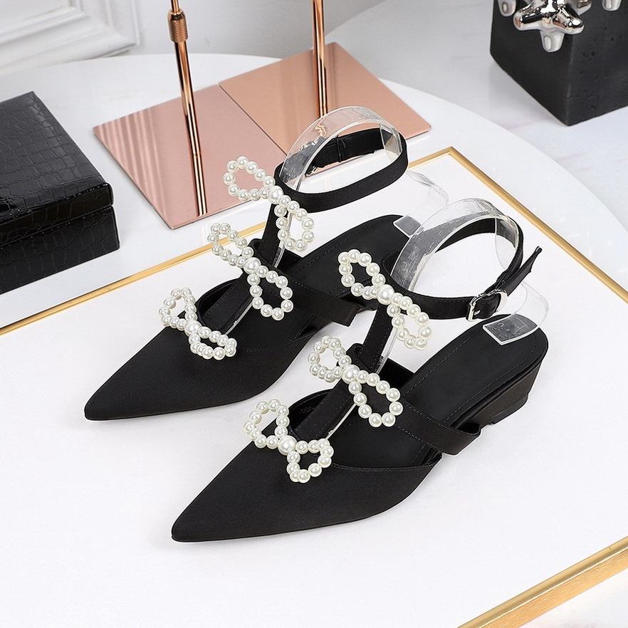 2025 verano nueva colección francés perla arco satén puntiagudo tacones altos elegante banquete Sandalias planas correa de hebilla de Metal Baotou