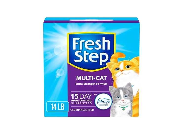Arena para gatos Fresh Step Clumping Fórmula de fuerza extra para varios gatos con frescura Febreze, arena para gatos múltiple 14 Lb. Caja