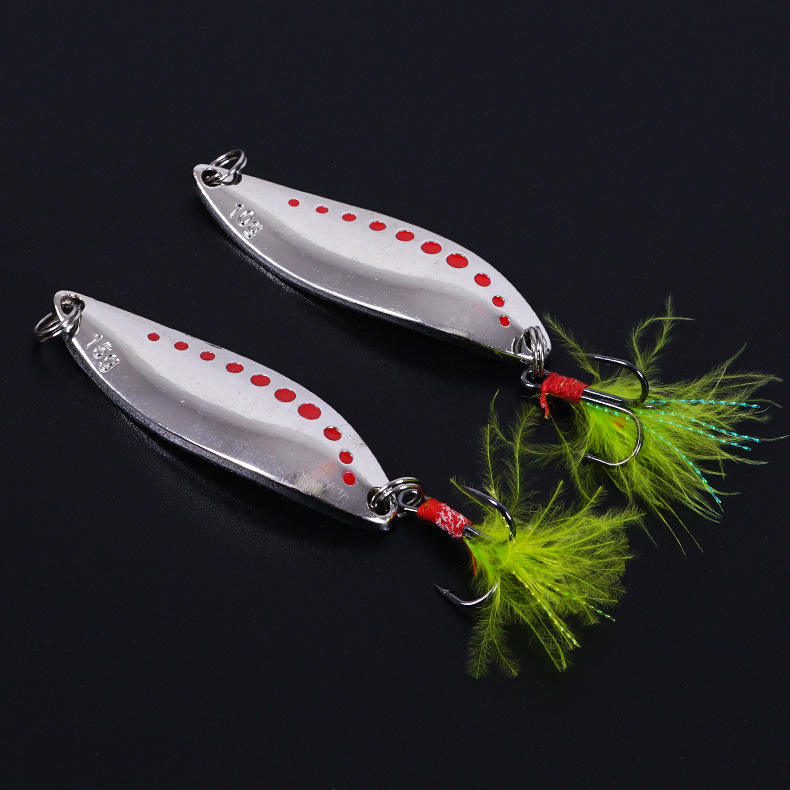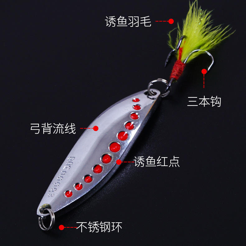 Señuelo giratorio de agua dulce, cebo biónico metálico para pesca de lubina, señuelo duro con puntos rojos y atracción de plumas