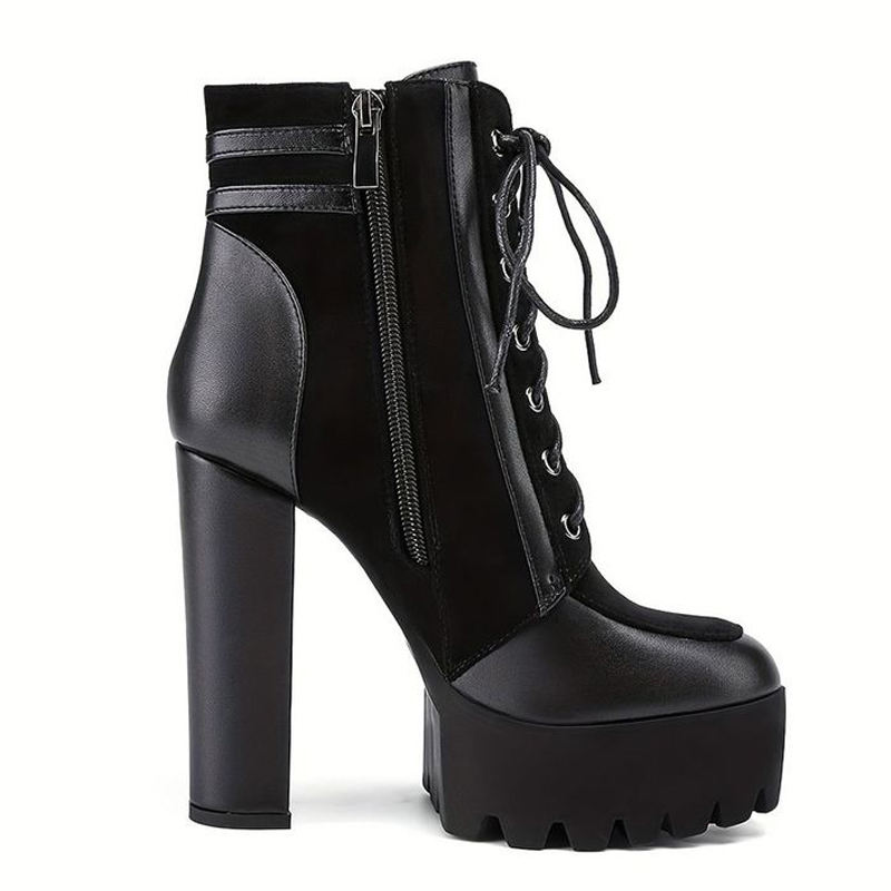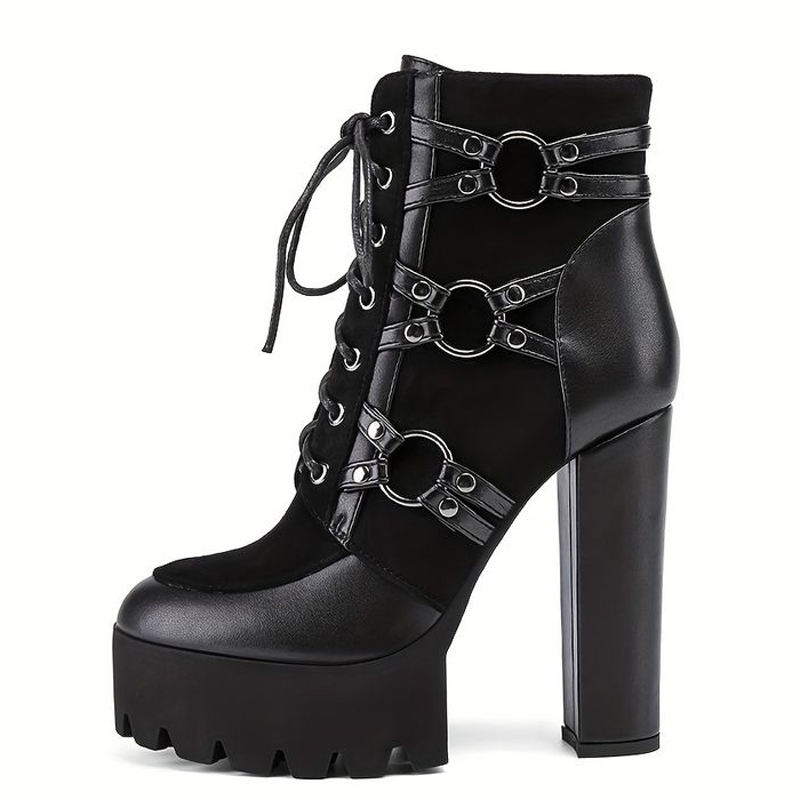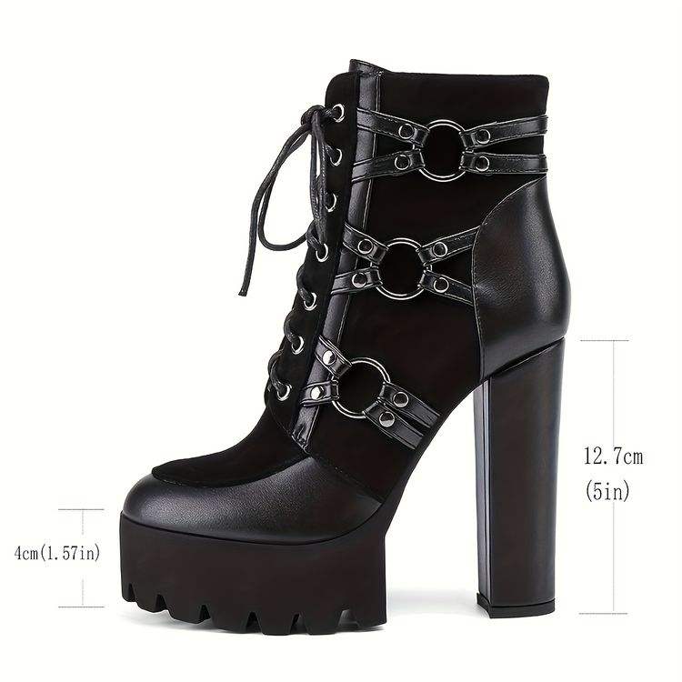 Botines Cortos con Cordones Delanteros y Punta Redonda para Mujer, Botas de Tobillo con Cremallera Lateral, Hebillas Metálicas y Tacones Gruesos