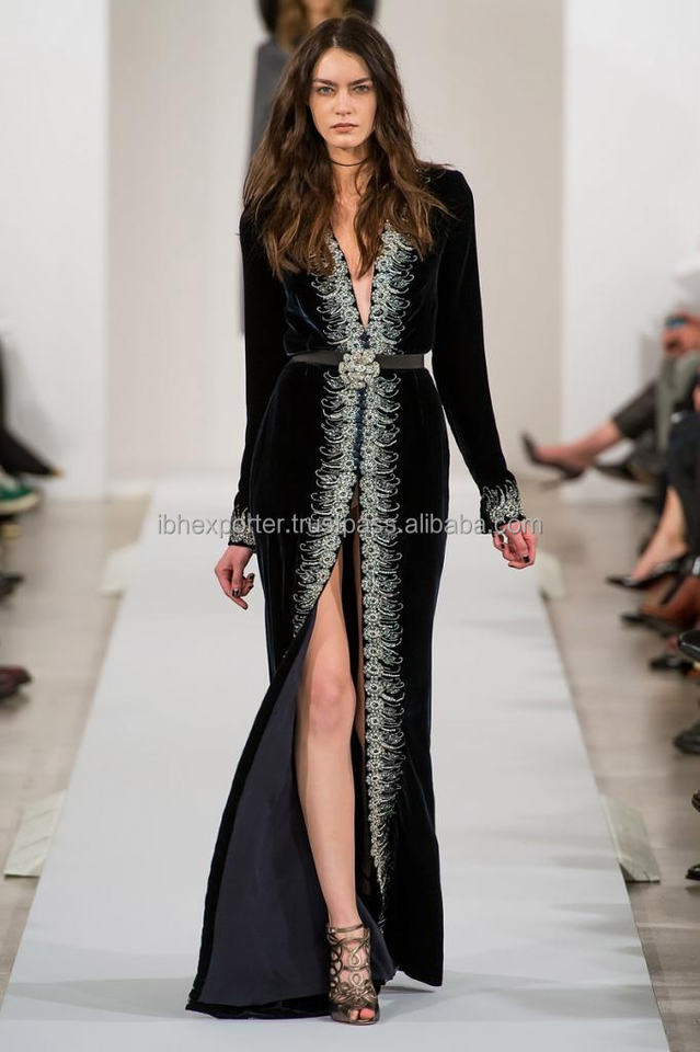 Frente abierto Slim Fit largo con cuello en V Estilo negro Kaftan con bordado de plata y cuentas funciona último diseño