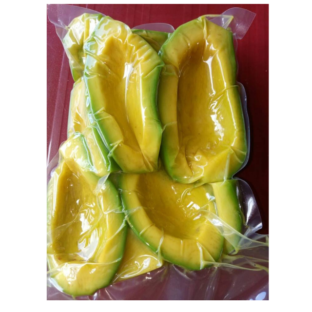 Rodajas de aguacate congelado con un color verde vibrante y consistencia suave, producido para aplicaciones alimentarias internacionales.
