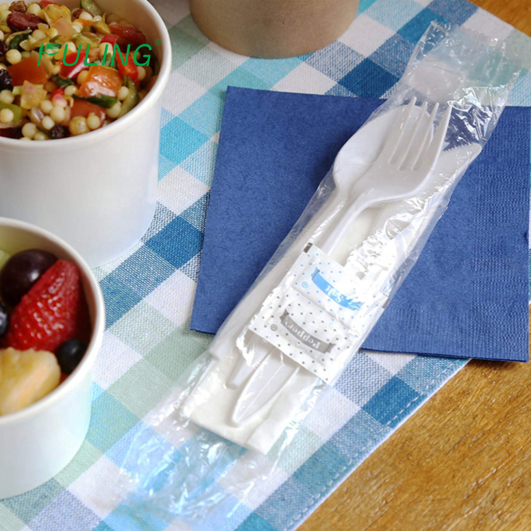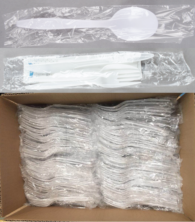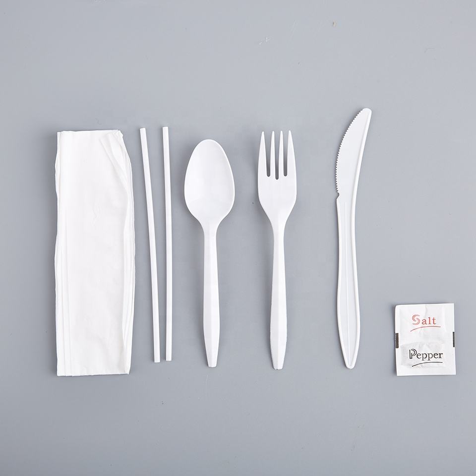 Cubiertos de plástico blanco, envueltos individualmente: tenedor, cuchara, cuchillo.Nombre del producto