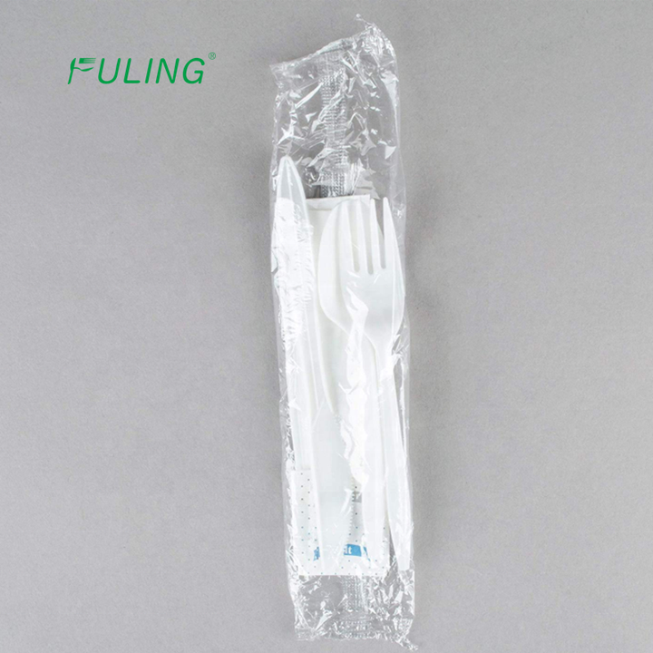 Juego de Cubiertos Desechables de Plástico Blanco Envueltos Individualmente de Peso Medio de Fábrica Fuling con Cuchillo, Tenedor y Cuchara