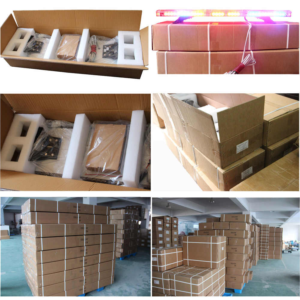 Caja de cartón estándar de exportación (grosor del tablero de cartón 0,5 cm), espuma de embalaje integrada, productos de paquete de bolsa de embalaje y correa de embalaje externa. Luces led intermitentes de emergencia, longitud completa, ámbar, rojo, azul, blanco, advertencia, HS6146