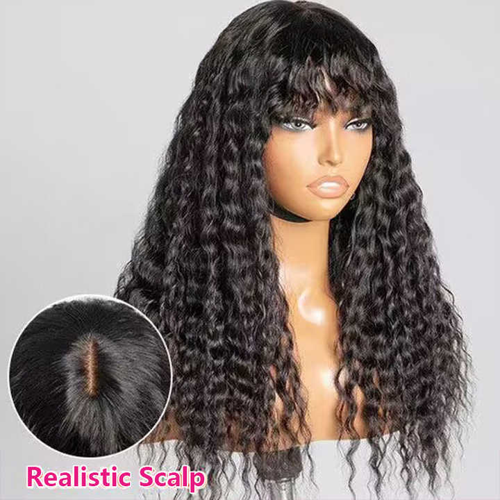 ISEE-Peluca de cabello humano con flequillo para mujeres negras, peluca con parte superior del cuero cabelludo falso natural mejorada hecha a máquina barata