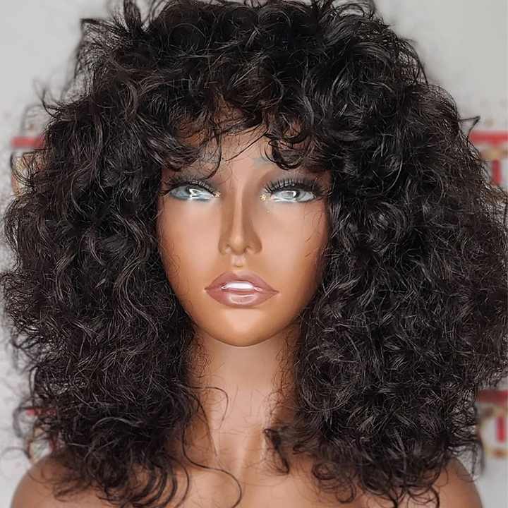 Peluca Completa Hecha a Máquina para Mujeres Negras, Pelucas con Flequillo Doblemente Cosidas sin Pegamento, Estilo Bob Rizado, Peluca Corta con Flequillo de Cabello Humano Virgen 100%