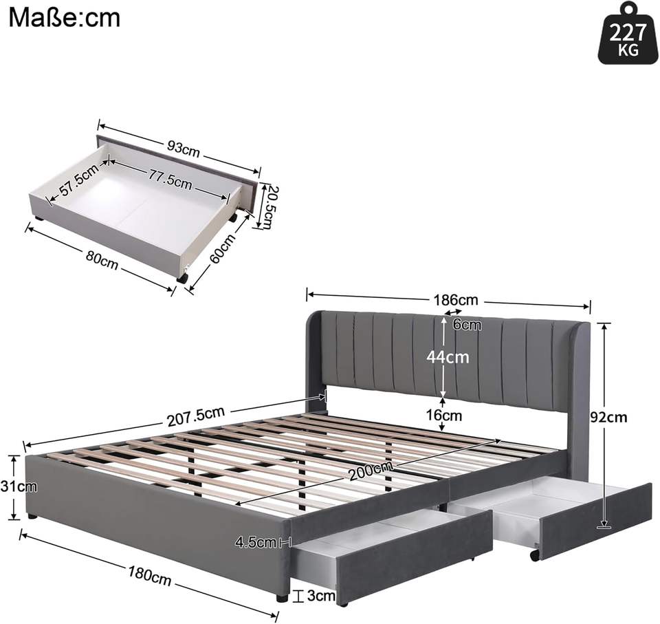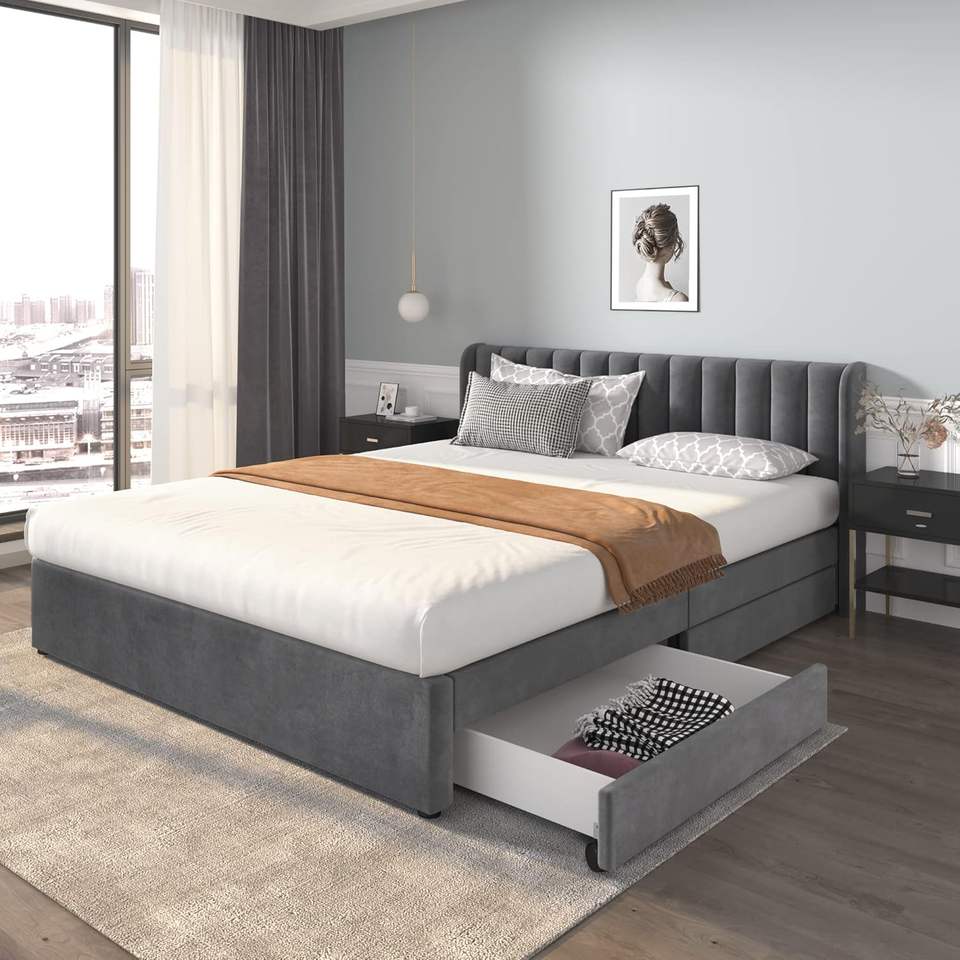 Base de Cama Moderna de Tamaño Completo con 2 Cajones, Estructura de Madera con Listones, Tapicería de Terciopelo y Cabecera Ajustable