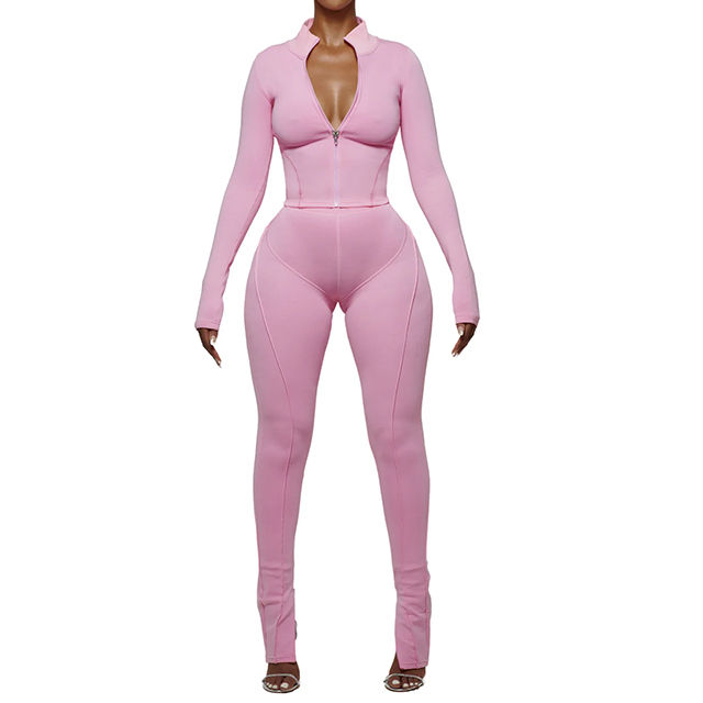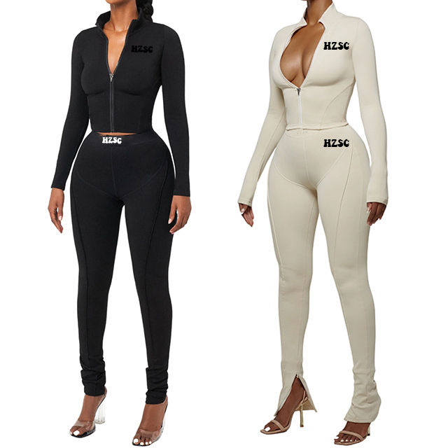 Full Slim Fit Otoño Invierno Dos piezas Terciopelo Conjunto de dos piezas Bolsillo con cremallera Manga larga Traje de mujer Ropa 2 piezas
