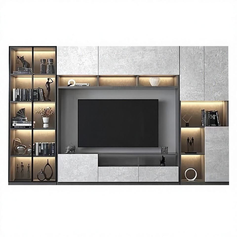 Consola de TV Integrada en Pared Completa con Iluminación LED Cálida, Diseño sin Tiradores de Dos Tonos con Estantes Abiertos y Cajones Inferiores