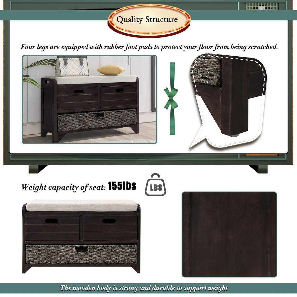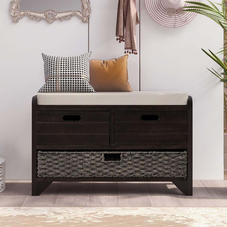 Banco de Almacenamiento para Zapatos Completamente Ensamblado con Cojín Extraíble y 2 Cajones, Incluye Cesta Extraíble