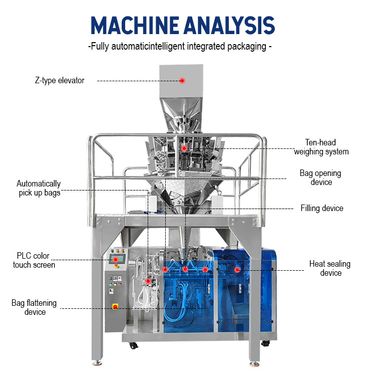 Máquina Empacadora de Bolsas Preformadas Tipo M, Totalmente Automática, Horizontal, para Empacar Nueces y Té a Granel