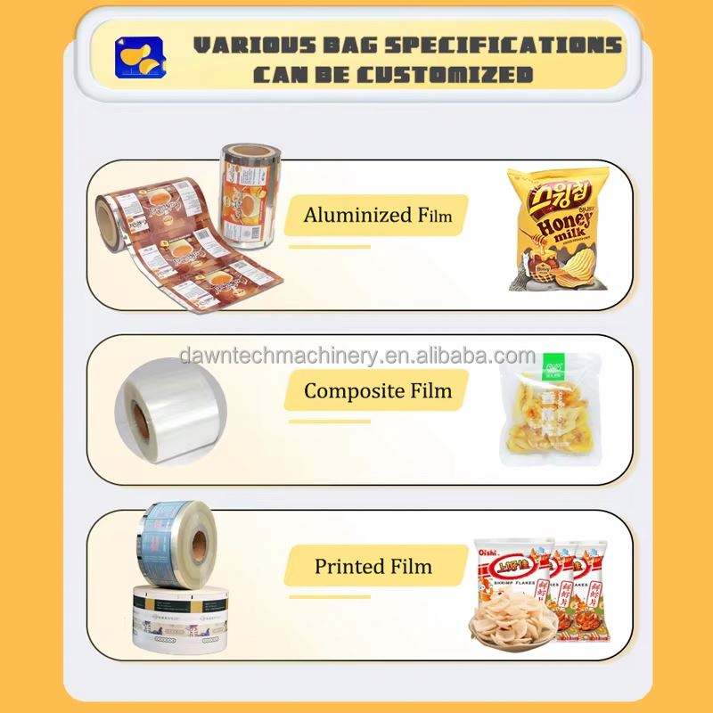 Máquina de Llenado y Empaquetado Vertical Automática para Snacks Inflados con Nitrógeno, Palomitas de Maíz y Papas Fritas