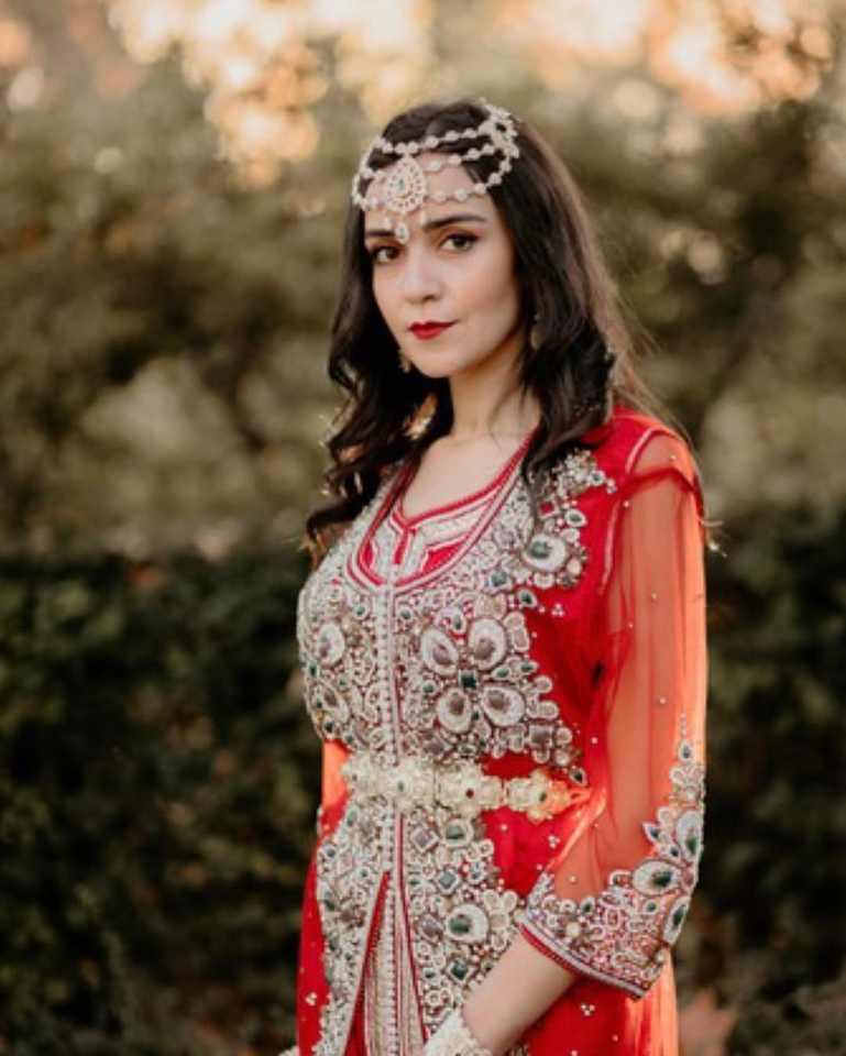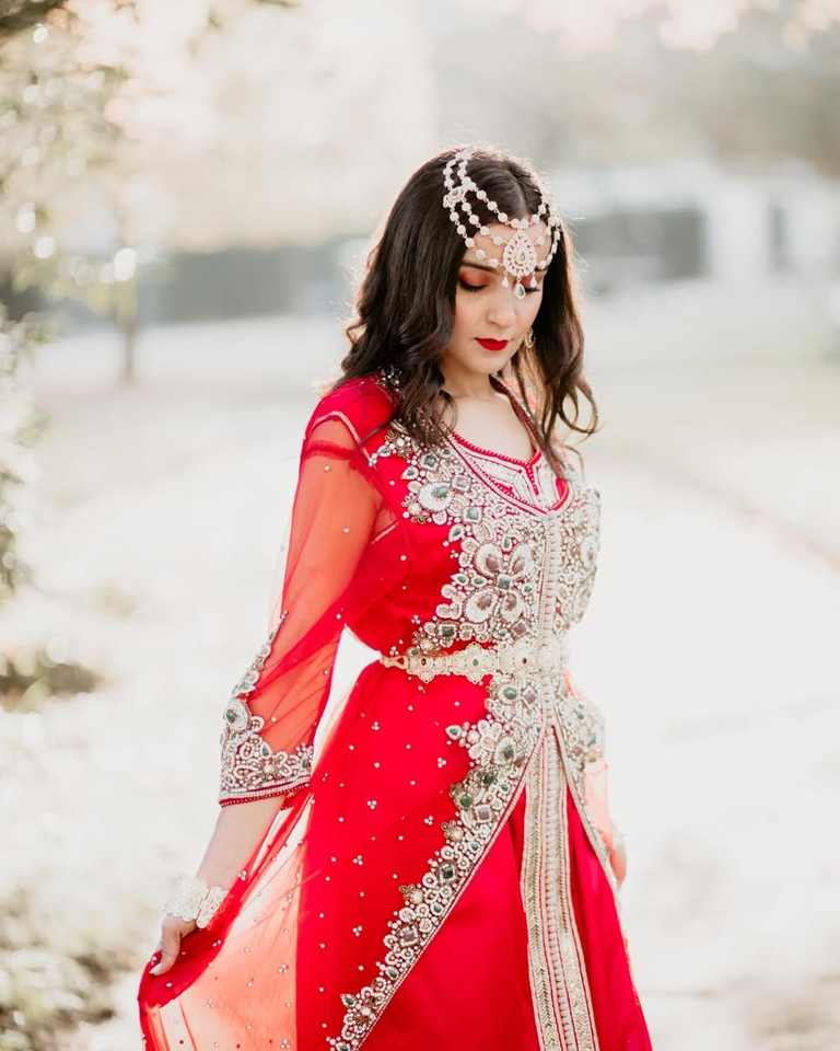 Caftán marroquí totalmente personalizable, gasa roja y seda con mangas de red, bordado hecho a mano, estilo informal, característica antiestática