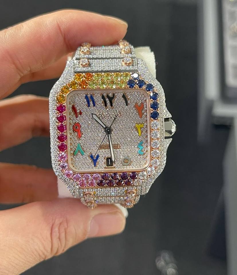 Reloj Analógico de Acero Inoxidable con Diamantes de Imitación Miyota Cuadrados Multicolores Totalmente Personalizados, Estilo Hip Hop para Hombre, Ancho de 20 mm