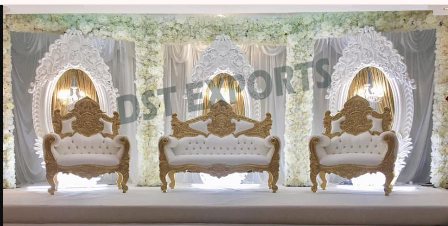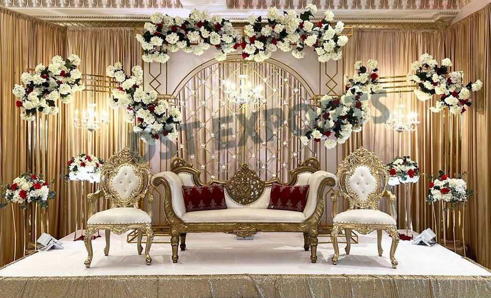 Conjunto de sofá de boda de diseño totalmente tallado a mano, conjunto de sofá de boda con decoración Walima elegante, conjunto de sofá de boda musulmán con acabado dorado