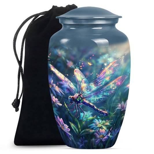 Urna Funeraria para Cenizas Humanas - Urna de Cremación para Adultos de Aluminio - Urna Conmemorativa Floral con Libélula Azul