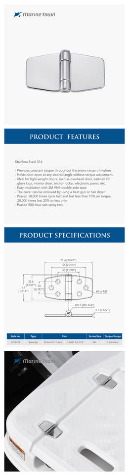 Bisagras para muebles Acero inoxidable 316 Barril arriba Bisagra de fricción cubierta 39,6X77,4mm